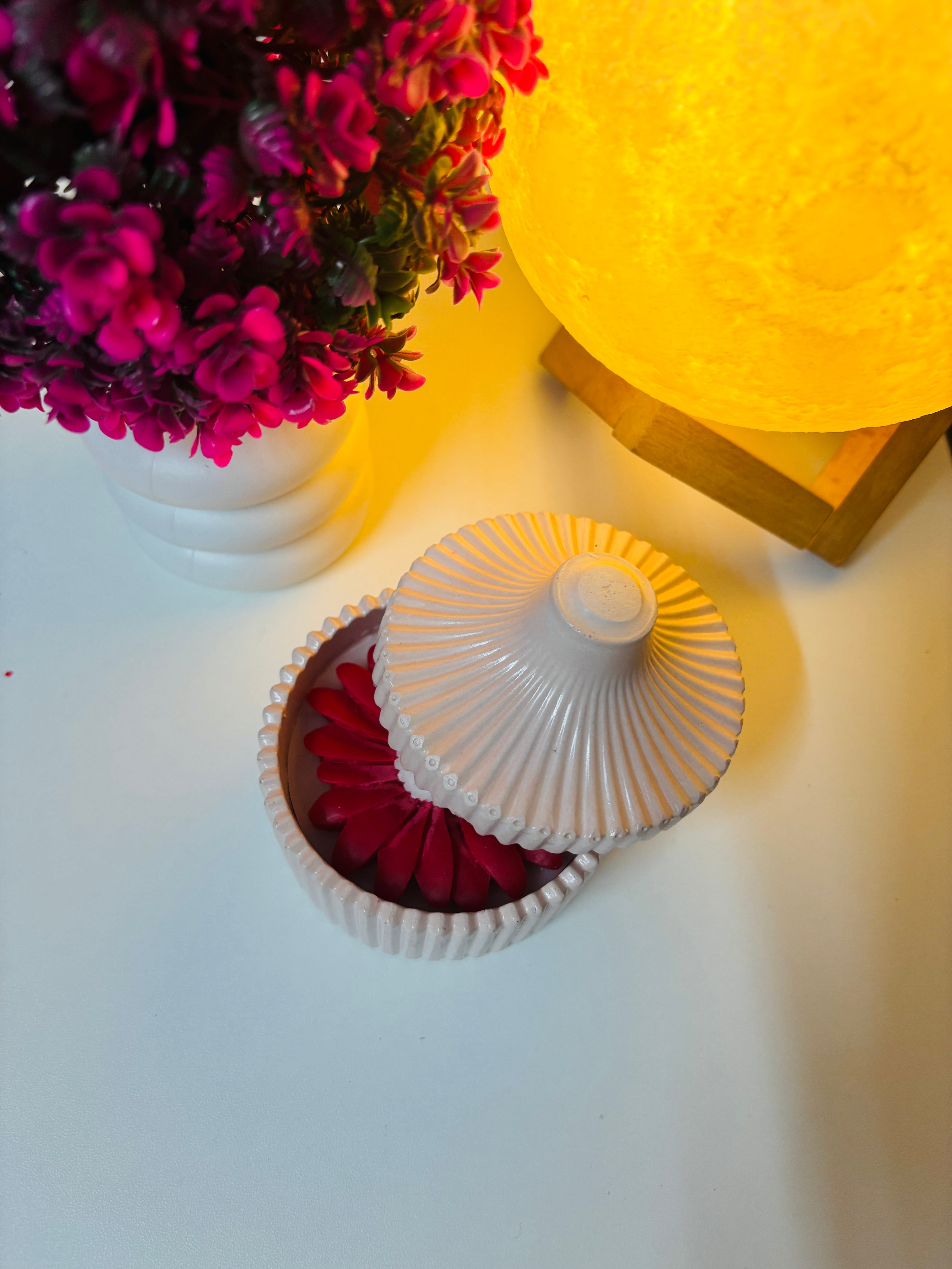 A perfect blend of elegance and functionality, our Bloom & Glow Trinket Candle features a delicately crafted flower-shaped soy wax candle nestled in a ceramic trinket dish.