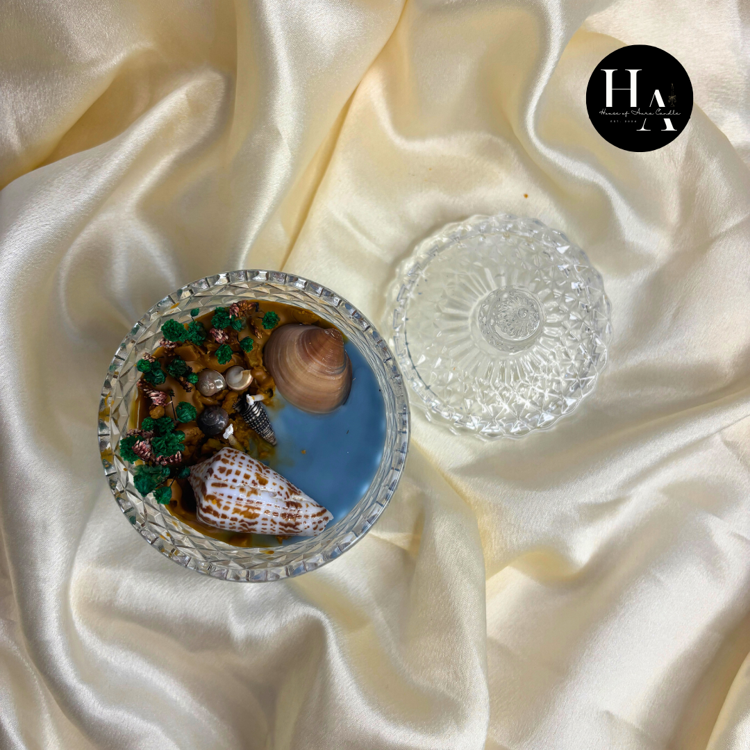 - Design: Ocean-inspired candle with embedded crystals, sea-shell elements, or foamy wax waves