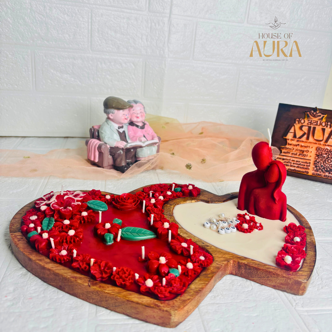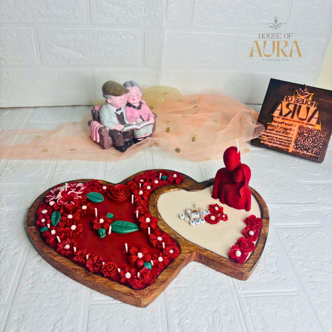 This candle is set in a beautiful double-heart carved wooden tray, where one heart blooms with wax florals, and the other carries a custom message with a wax couple figurine or initials — making it a stunning keepsake for couples.