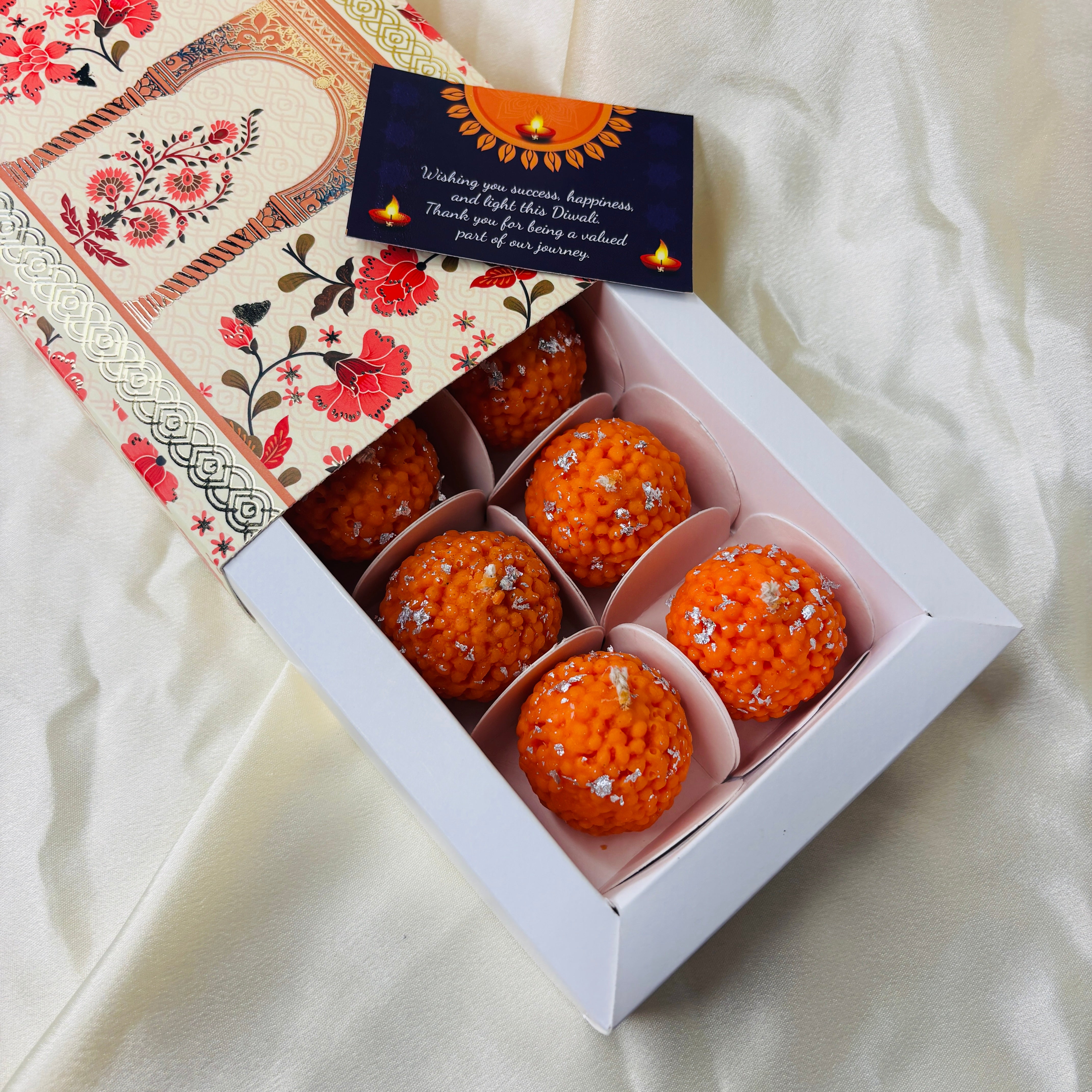 Each candle is hand-poured to resemble a classic motichoor laddu, making it the perfect addition to your festive décor, gifting hampers, or return gifts for weddings and pujas.